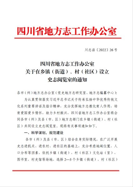 中新网四川新闻3月15日电(王爵) 15日,四川省地方志办印发通知,将在全省乡镇(街道)、村(社区)设立省市县三级共建的史志阅览室。