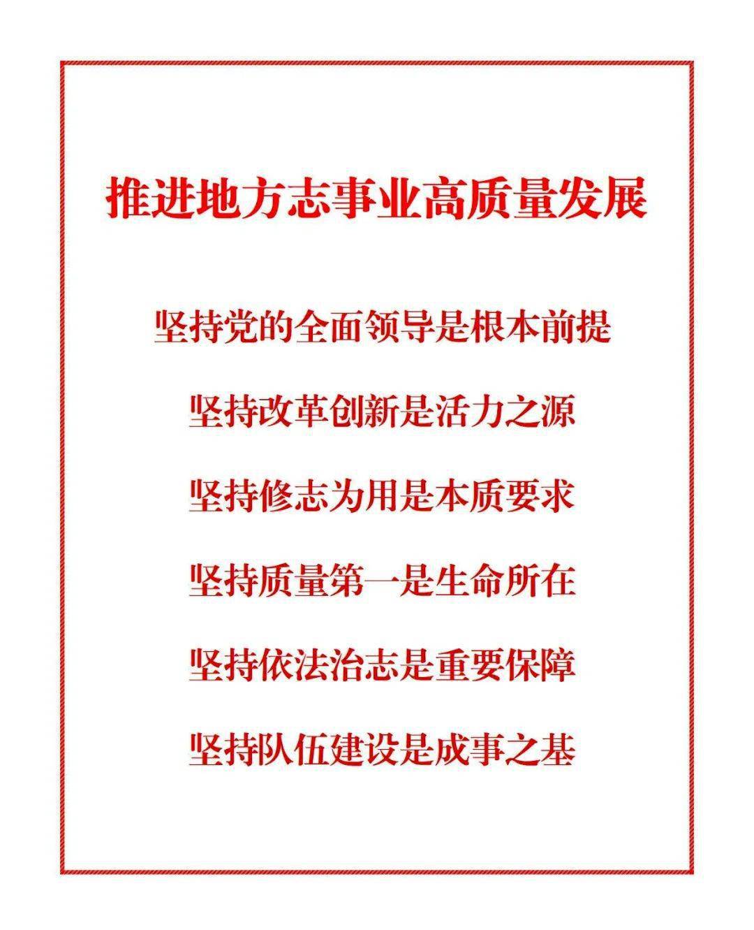 会议认为,推进地方志事业高质量发展,坚持党的全面领导是根本前提,坚持改革创新是活力之源,坚持修志为用是本质要求,坚持质量第一是生命所在,坚持依法治志是重要保障,坚持队伍建设是成事之基。